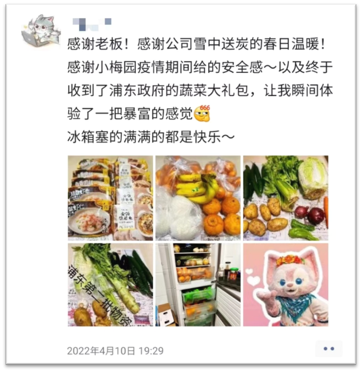 公司非常關(guān)心同事們的生活,并盡全力去解決我司在疫情期間生活上的困難。在全面封閉管理開(kāi)始之前,我司為全體上海員工準備并發(fā)放了食品物資;在封閉期間,對于物資緊張、買(mǎi)不到菜的員工,公司也想盡辦法為其進(jìn)行物資支援。同時(shí),公司也十分重視員工的情緒穩定,對員工定期進(jìn)行疏導,轉移注意力,適當宣泄壓力。