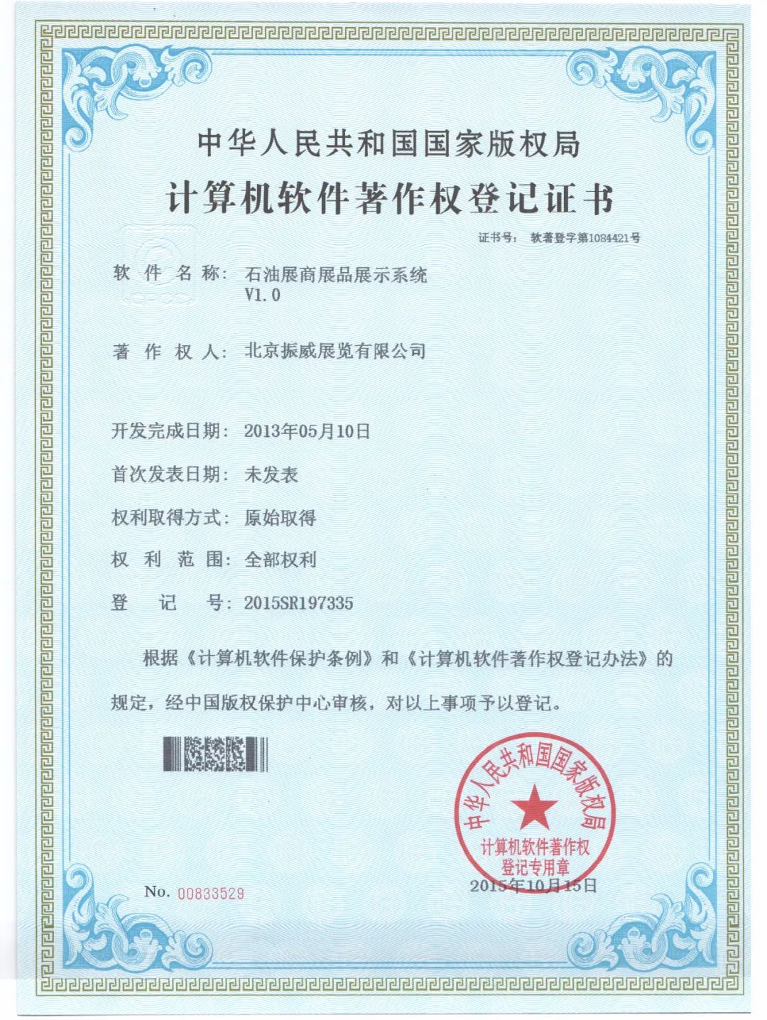 計算機軟件著(zhù)作權登記證書(shū)(石油展商展品展示系統V1.0)